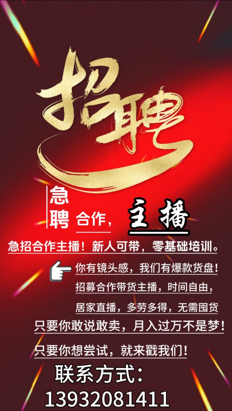【诚聘】: 急招合作主播!新人可带,零基础培训。 你有镜头感,我们有爆款货盘! 招募合作带货主播,时间自由,居家直播,多劳多得,无需囤货 只要你敢说敢卖,月入过万不是梦! 只要你想尝试,就来戳我们!