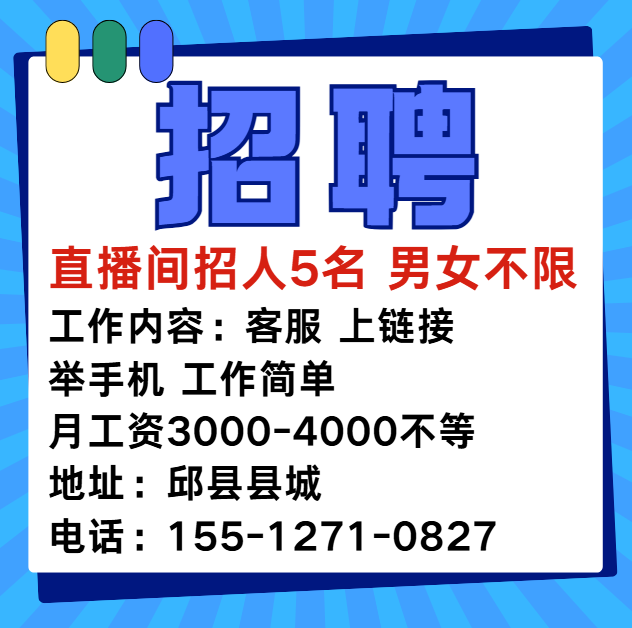 直播间招人5名 男女不限 工作内容:客服 上链接 举手机 工作简单 月工资3000-4000不等 地址:邱县县城
