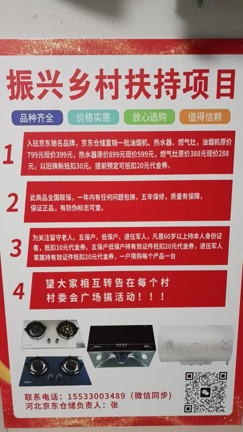 京东入驻品牌为扶持乡村振兴项目,京仓储直销一批烟机,燃气灶,热水器60升,原价都是799元.388元,899元,现价399元,288元,599元,全国联保,一年之内有任何问题包换,五年保修,保证正品,有防伪标签上网可查,提前预订购买一律优惠10元之20元,为关注留守老人,推出一下优惠政策,凡六十岁以上老人持身份证购买,一律抵扣十元代金券,五保户,低保户持有效证件一律抵扣20元代金券,退伍军人及家属持有效证件一律抵扣20元代金券,每个村都搞一次活动,