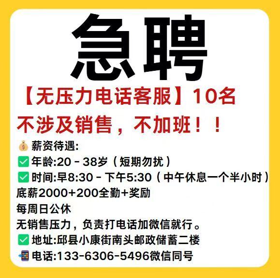 底薪2000+200全勤+奖励, 每周日公休, 无销售压力,负责打电话加微信就行。