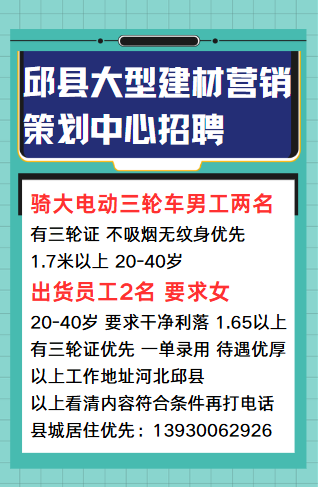 邱县大型建材营销策划中心招聘:出货员工2名,女,20到40岁,要求干净利落,1.65以上,有三轮证优先,一单录用,待遇优厚,县城居